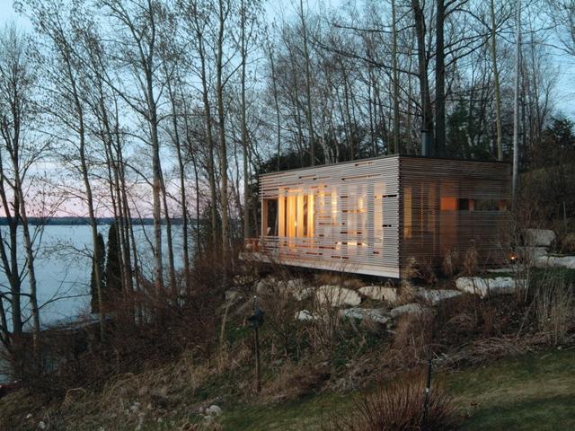 这个轻的由绝缘玻璃组成的木屋在三侧被松木板固定,绿色的屋顶上种植着景天属植物和其他药草,远远地给人们带来新意。