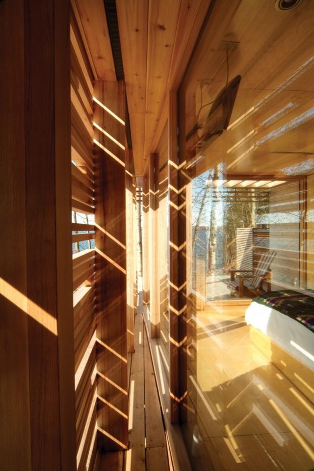 简单的家具包括一个带有内置柜子的床,一墙的橱柜和一个烧柴的火炉。所有的室内空间,包括地板和天花板都是由桦木胶合板做成。
